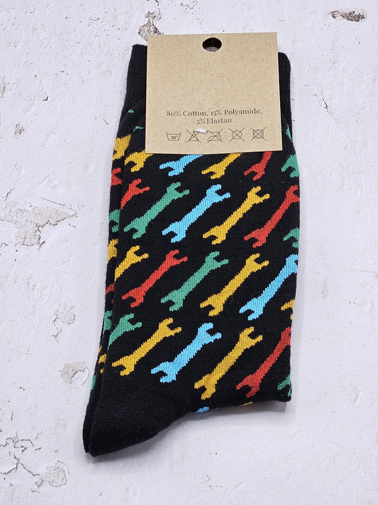 Moersleutel sokken, zwart met gekleurde moersleutels. Maat 43-46.